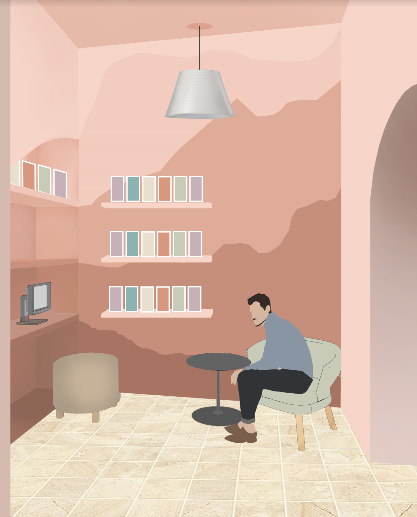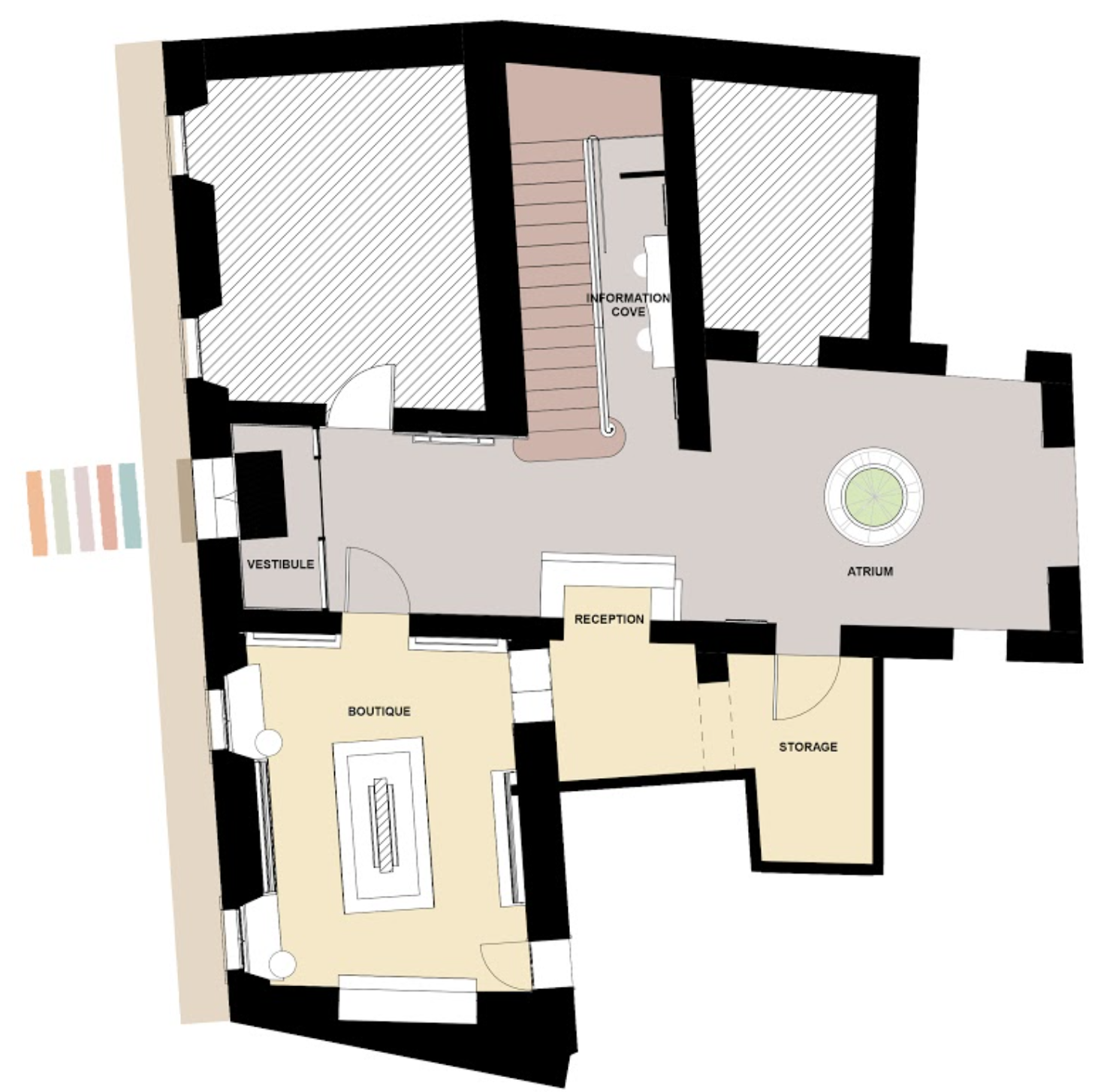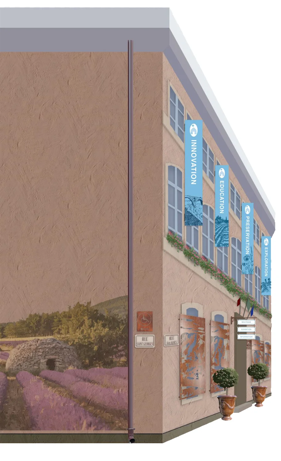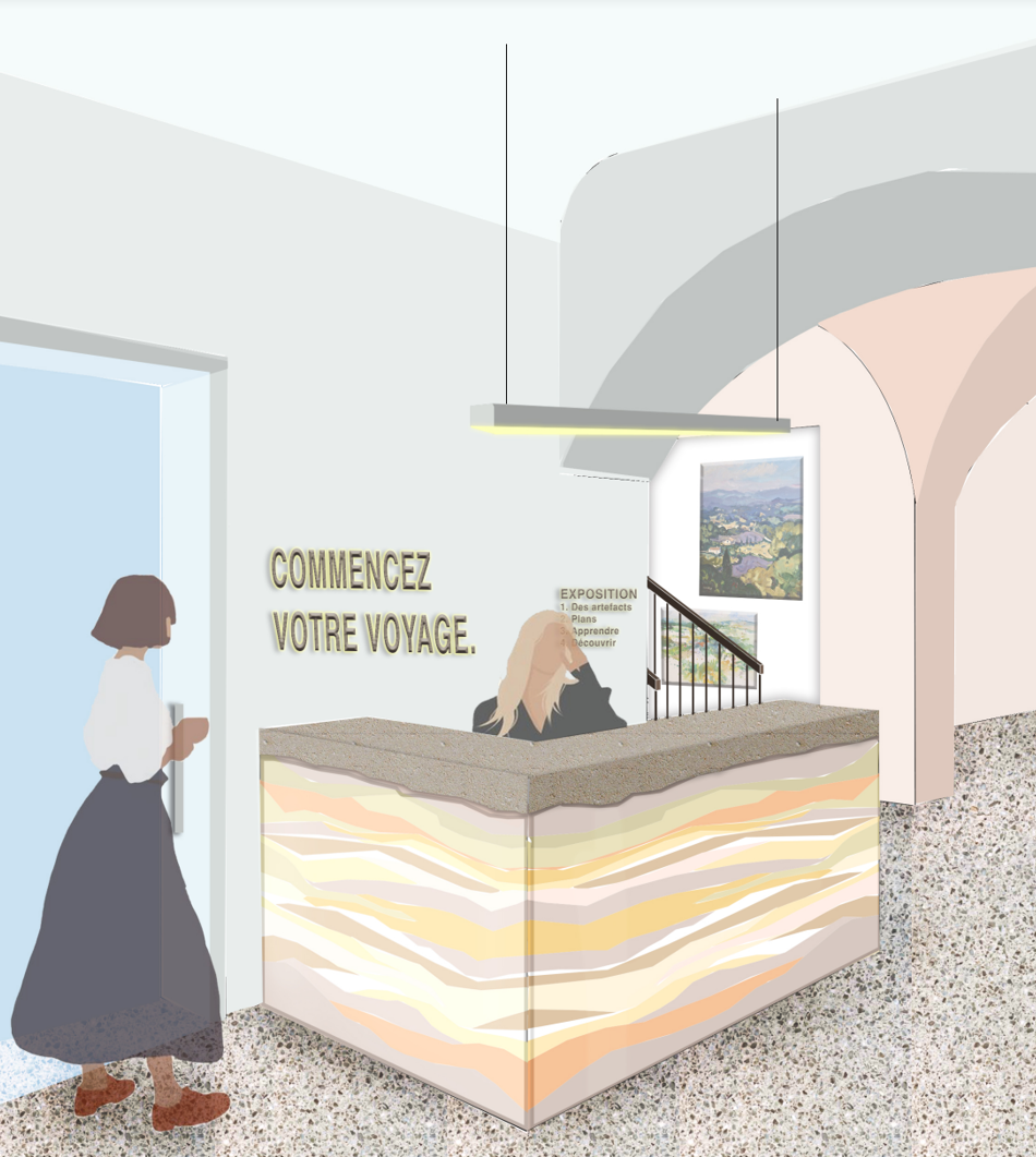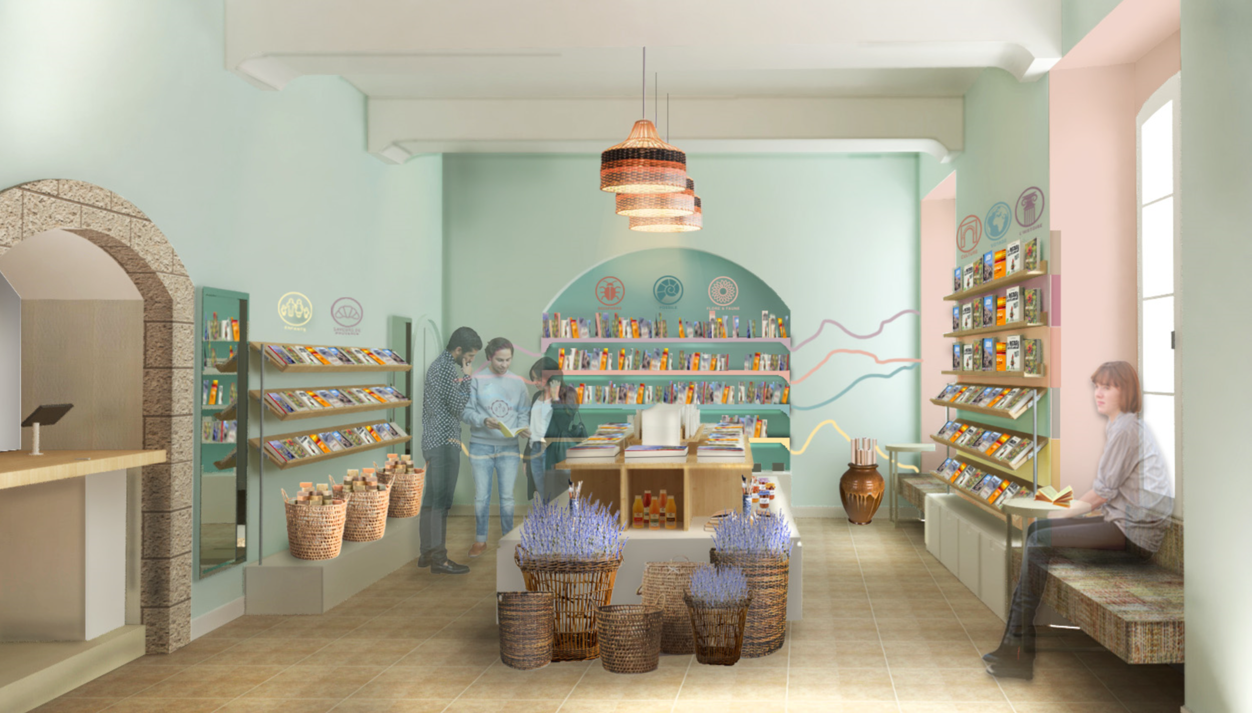 Upon entering the boutique guests will be greeted by a bright aesthetic that reflects the provincial color pallet. The boutique is newly designed to maximize storage and display space while creating an eclectic shopping experience. Each display exhibits the book covers to easy browsing and has drawers or cabinets bellow for re-stocking goods. Iconography and color-coding will improve organization by creating zoning. These icons can later be implemented into the exhibition spaces. Elements such as the baskets and pottery are reminiscent of Apt market. These will display goods such as lavender and poster rolls.