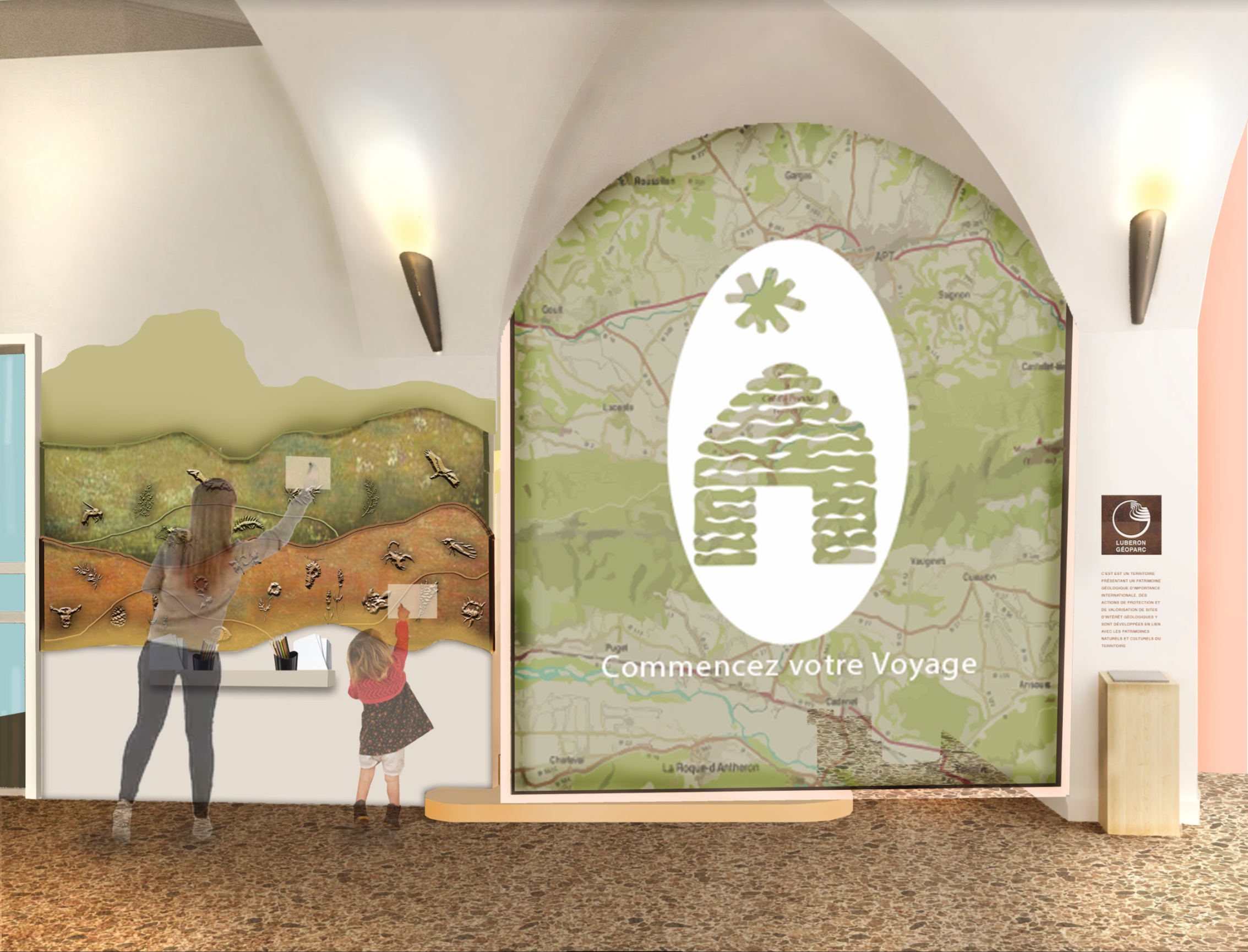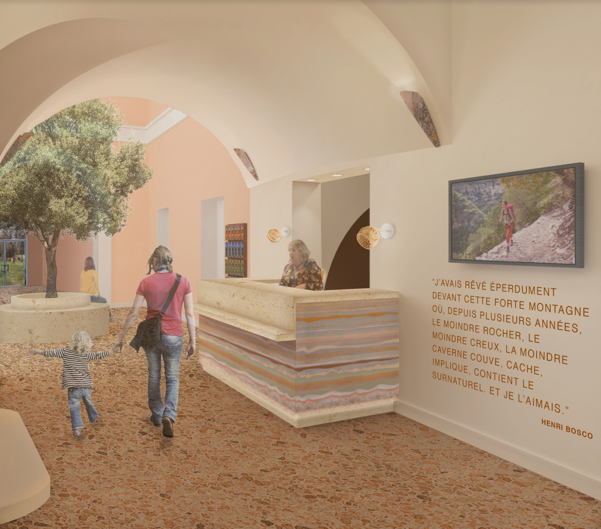 The journey begins upon the entrance of the building. The exterior doors will be kept open during the day by a magnetic system, this will encourage visitors to enter. The new vestibule will have automatic doors that will improve air lock efficiency as well as circulation. The glass will have a logo decal as well as operating hours. Most important, guests will enter in a full immersion of the Luberon Region that is uplit by a glowing mountain motif.