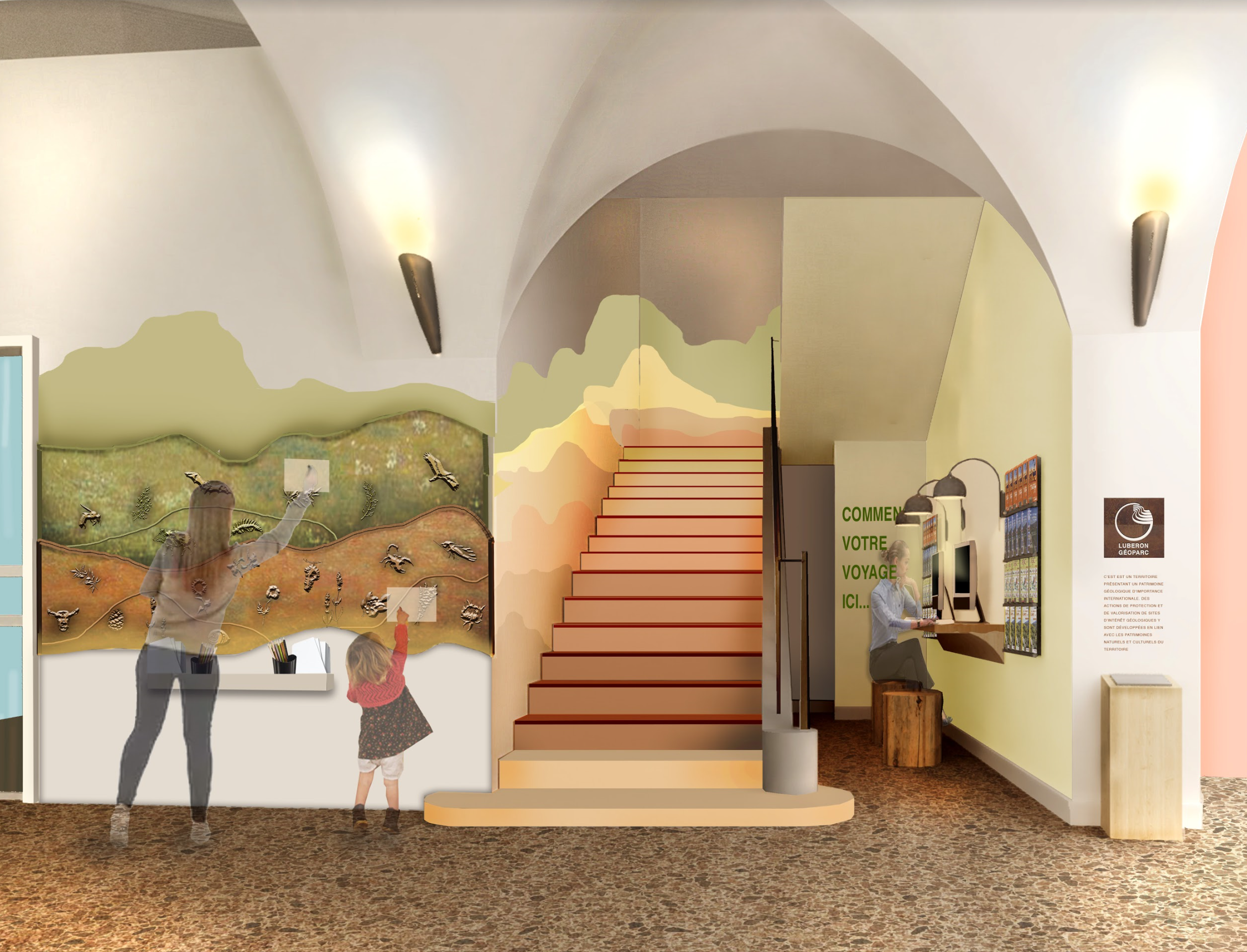 The lobby will be a fun and enticing space that encourages guests to explore. The gradient of the stairs encompass the colors of the Luberon as a mountain climbs up the stairs. Parallel to the stairs is the information cove which will house the computers for hikers resources. There will be additional maps and brochures. We relocated this area for ease of communication with the receptionist. The information cove as well as the first floor can be locked at night with the security gate and will have a canvas cover for events as a backdrop. The custom ochre wall is a feature that will bring the community together. Created by a local artist in a traditional graffito technique, images of flora and fauna will be raised and recessed for an interactive rubbing wall. This is something guests can bring home with them and remember the Luberon.