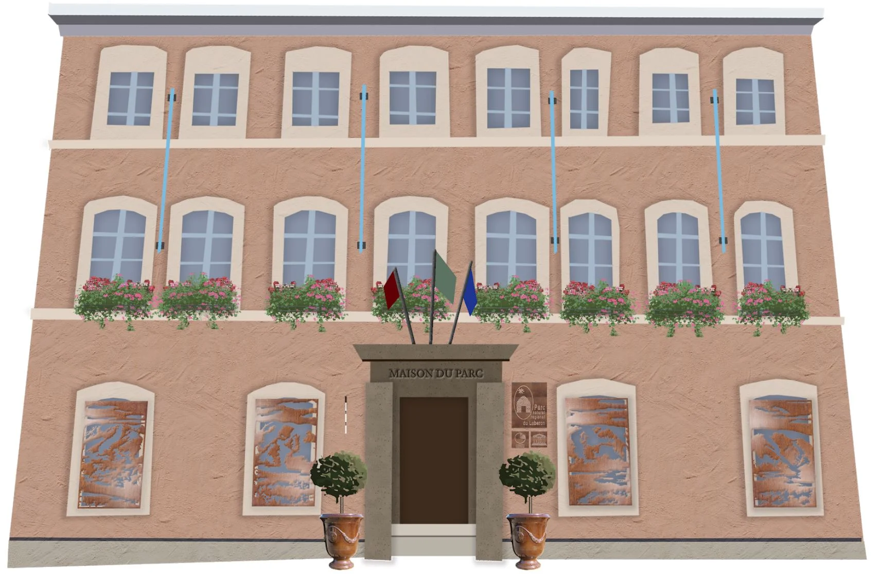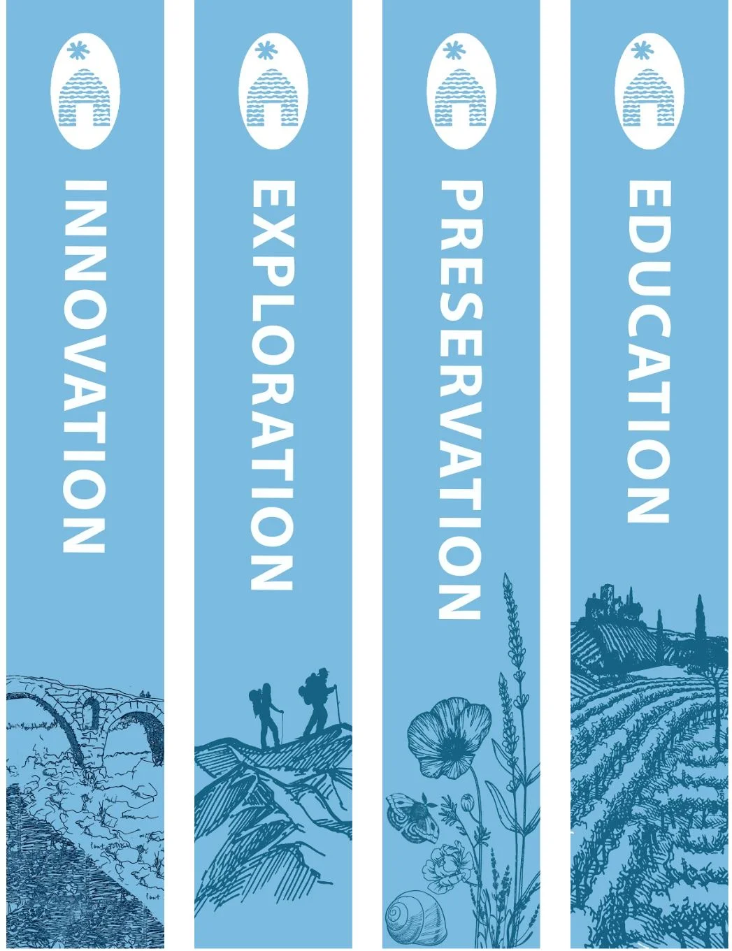 Banners representing the opportunities Maison du Parc offers, in a light blue representing the traditional blue seen on French window treatments.